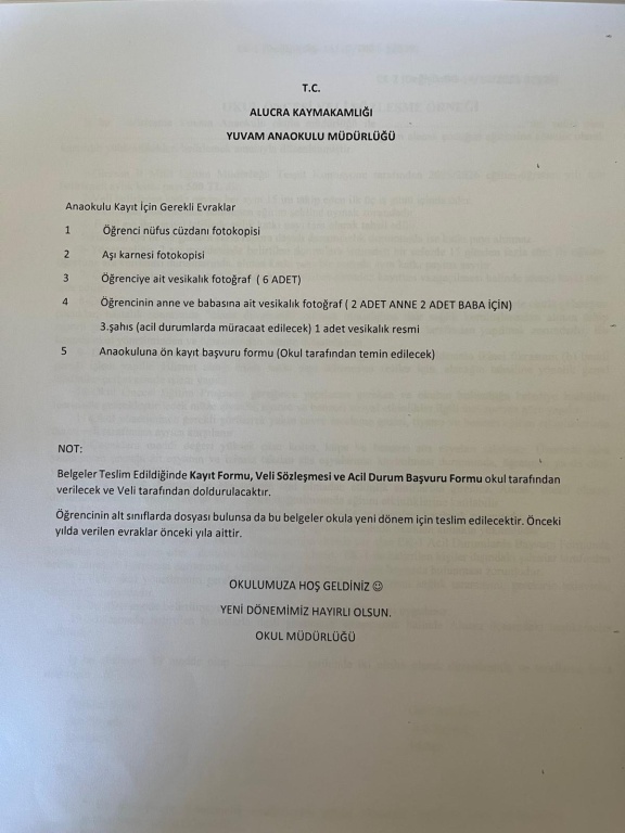 5 Anaokuluna ön kayıt başvuru formu (Okul tarafından temin edilecek)