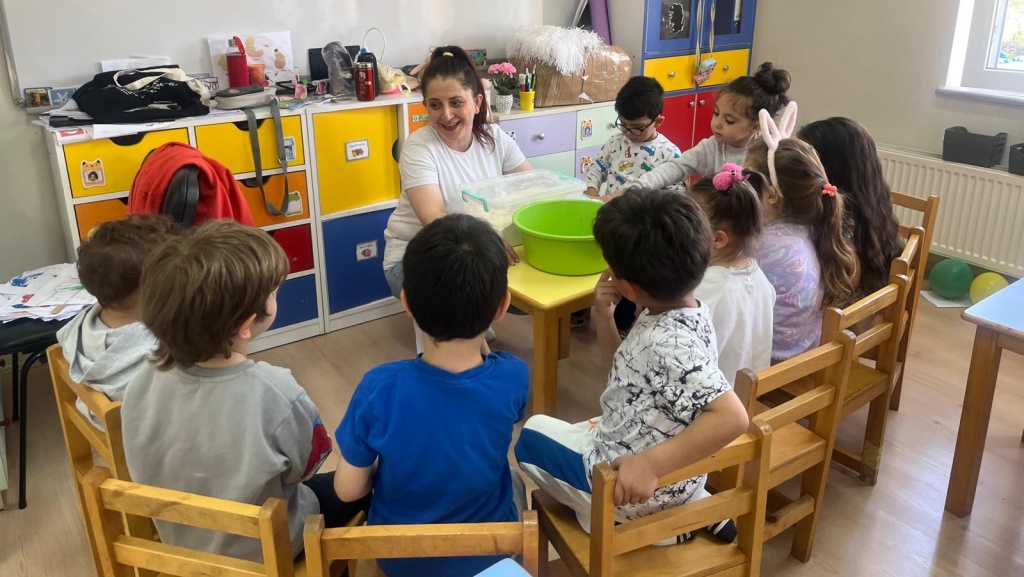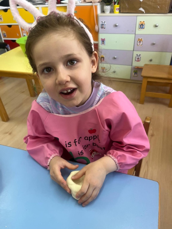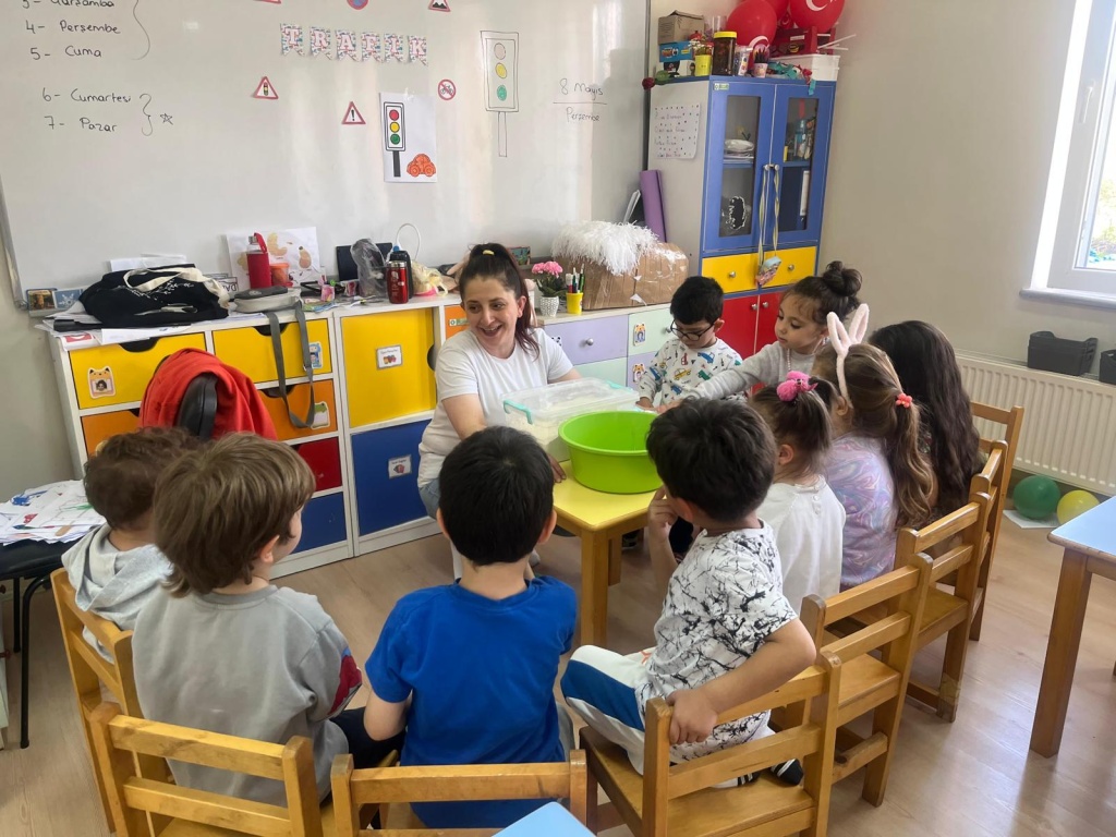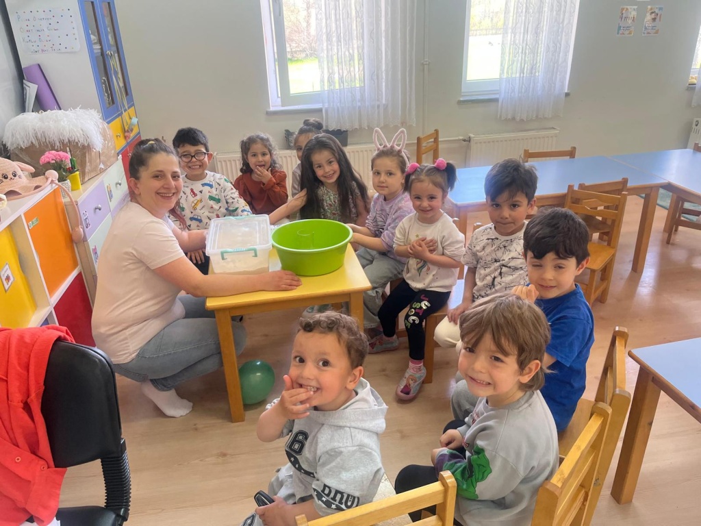 Aile katılımı etkinliği olarak 3-4 yaş sınıfı tuz seramiği etkinliği yapmıştır. Yaptıkları hamurlara ellerinin şeklini verip anneler gününde annelerine hediye olarak sunmuşlardır.